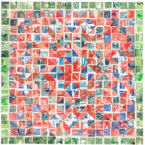 The postage stamp collage is inspired by traditional geometric quilting patterns.