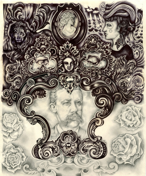 My influences include tattooing, taxidermy, Victoriana, antique markets, nursery rhymes, iconography, collectors etc. I work predominantly in ball point pen and pencil on antique paper.